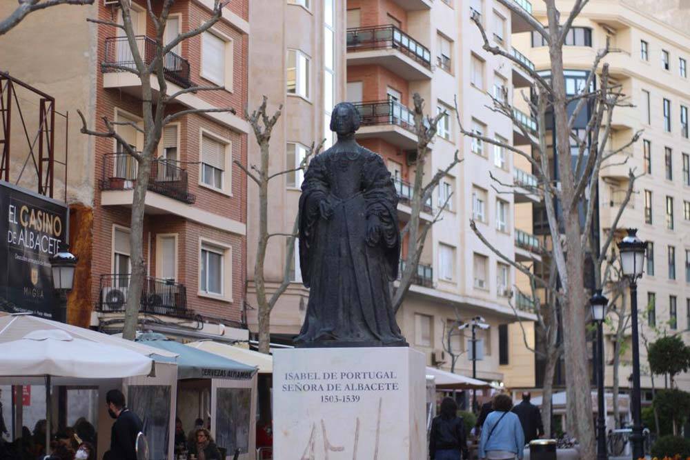 Es posible ver la replica de esta estatua en la Plaza de la Constitución albaceteña, elevada sobre un pedestal donde figura la inscripción; Isabel de Portugal. Señora de Albacete. 1503-1539.